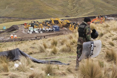 LIM03. CAJAMARCA (PERâ) 24/11/2011.- Un destacamento de la PolicÃa peruana custodia maquinaria del proyecto Conga, de la minera Yanacocha, la mayor productora del oro de SuramÃrica, hoy, jueves 24 de noviembre de 2011, en Cajamarca, regiÃn del norte peruano. El paro indefinido convocado por el Frente de Defensa Ambiental de Cajamarca contra ese proyecto minero empezà con la suspensiÃn de actividades en mercados y escuelas, adem·s de una mÃnima circulaciÃn en las carreteras. EFE/Paolo Aguilar