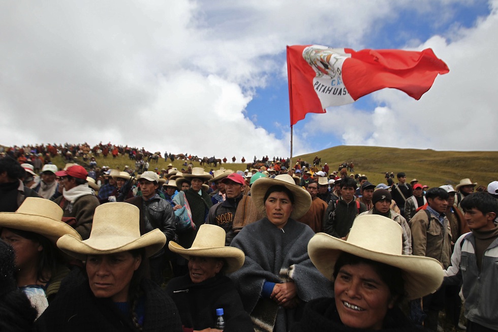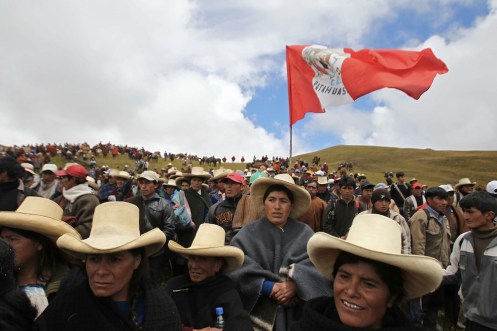 LIM07. CAJAMARCA (PERâ), 24/11/2011.- Protesta de comuneros en Piedra Redonda El Amaro durante el paro indefinido convocado en la regiÃn de Cajamarca (norte de PerË) contra el proyecto aurÃfero Conga, el cual transcurre pacÃficamente y con marchas en algunas ciudades hoy, jueves 24 de noviembre de 2011, segËn reportes de la PolicÃa y de la DefensorÃa del Pueblo en la zona. EFE/Paolo Aguilar