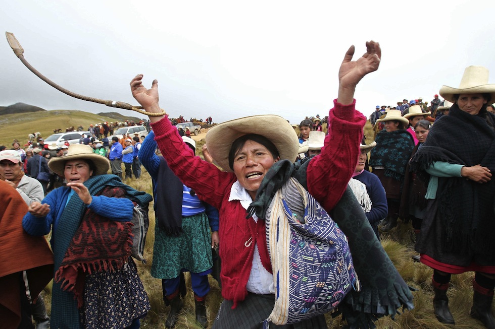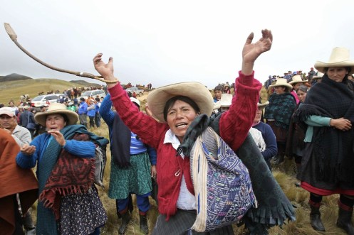 LIM09. CAJAMARCA (PERâ), 24/11/2011.- Protesta de comuneros en Piedra Redonda El Amaro durante el paro indefinido convocado en la regiÃn de Cajamarca (norte de PerË) contra el proyecto aurÃfero Conga, el cual transcurre pacÃficamente y con marchas en algunas ciudades hoy, jueves 24 de noviembre de 2011, segËn reportes de la PolicÃa y de la DefensorÃa del Pueblo en la zona. EFE/Paolo Aguilar