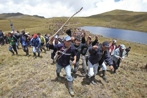 LIM08. CAJAMARCA (PERâ), 24/11/2011.- Protesta de comuneros en Piedra Redonda El Amaro durante el paro indefinido convocado en la regiÃn de Cajamarca (norte de PerË) contra el proyecto aurÃfero Conga, el cual transcurre pacÃficamente y con marchas en algunas ciudades hoy, jueves 24 de noviembre de 2011, segËn reportes de la PolicÃa y de la DefensorÃa del Pueblo en la zona. EFE/Paolo Aguilar