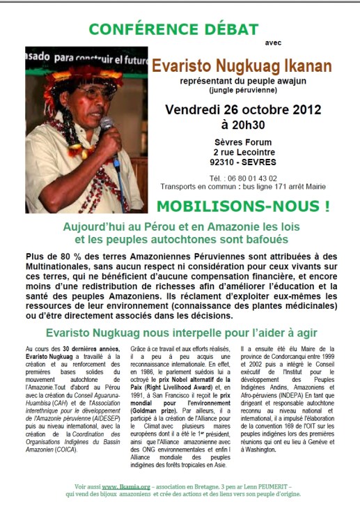 Conférence Débat avec Evaristo Nugkuag Ikanan, représentant du peuple Awajun (jungle péruvienne) le vendredi 26 octobre 2012 à 20h30 à Sèvres Forum, 2 rue Lecointre, 92310 Sèvres. Pour télécharger le programme, cliquer ici.